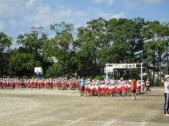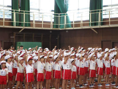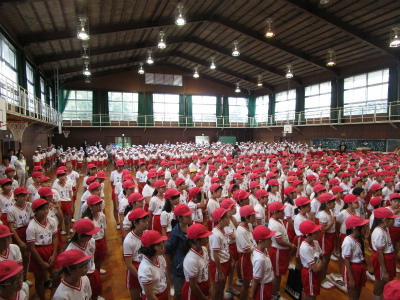 月曜日から運動会の練習が始まりました。2週間という短い練習期間です。一日も無駄にしたくはありませんが、今日は生憎の雨。第1回目の全体練習も体育館で行いました。900人近い児童で体育館はいっぱい!!運動をするスペースはありませんので、運動会の歌の練習となりました。紅組も白組も体育館の屋根が吹き飛びそうなほど、元気に「ゴーゴーゴー」を歌うことができました。