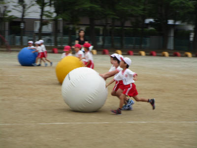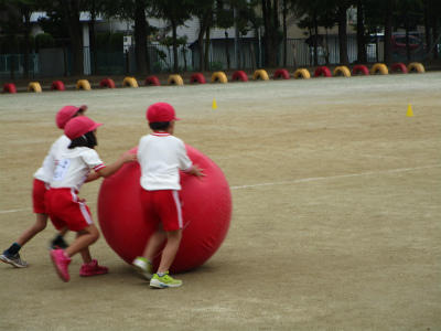 2年生は、「大玉ころころ」の練習をしました。大玉と一緒に転がってしまわないよう、転がし方を工夫しながらがっばって走りました。