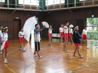 3年生は、「友の友による友のための『友よ』」です。クレヨンしんちゃんの映画主題歌の曲に合わせ、大きなフラッグを使ってダンスをします。今日は、隊形移動を中心に練習を行いました。