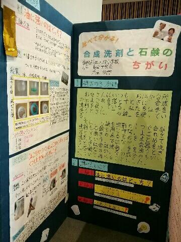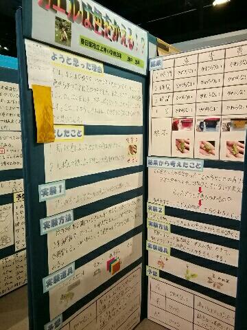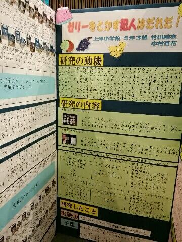 3年生は⌈カエルは色をかえる!?⌋、4年生は⌈ゼラチンは酵素に勝てるのか!?⌋、5年生は⌈ゼリーをとかす犯人はだれだ!⌋、6年生は⌈比べて分かる!合成洗剤と石鹸のちがい⌋が出品されました。
