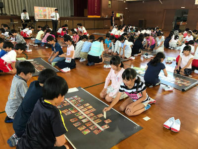10/29日、日曜日、ウイングハットで行われるかすかべ郷土かるた大会に向けて、教育委員会社会教育課の皆様の協力を得て、昼休みに体育館で練習を行いました。
