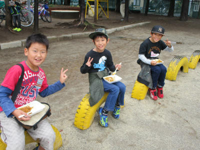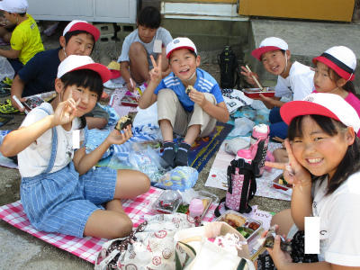 企画委員の子供たちは、お弁当の献立や開会式の内容を考えたり、1学期から準備をしてくれました。コントを交えたお弁当説明に大爆笑! 星形のポテトフライ、大凧をイメージした四角いハンバーグ、チーム上沖の焼き印が入った卵焼き・・・・・一つ一つ味わいながらいただきました。