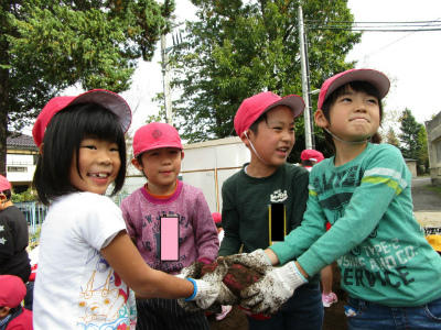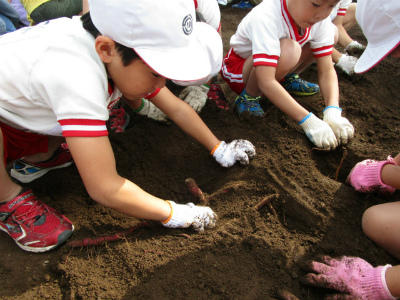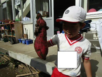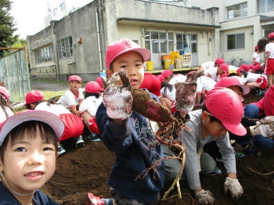 今日は、1・2年生、7・8組さんがいもほりをしました。太い根をたどって一生懸命に土を掘りました。大きなおいもに歓声がわきました。
