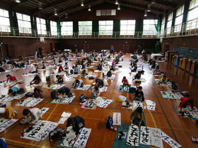 今日は、3年生が体育館で競書会を行いました。4月から毛筆の学習を進めてきましたが、だるま筆を使っての書きぞめは初体験です。短い練習期間の中で、大きな文字がかけるようになりました。今日もお手本をみながら、一生懸命に作品を仕上げました。手が真っ黒になっている子、顔にひげができてしまった子・・・・・・苦戦する子もいましたが、最後は全員で作品をもって記念写真をとることができました。