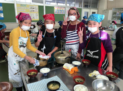 5年4組の調理実習で、先日の音楽会の引率の御礼に校長先生を招いて一緒にごはんとみそ汁を食べました。みそ汁の具は、それぞれの班ごとに考えて選んでいました。煮干しやかつお節を出汁に使ったみそ汁は、ひと味違っておいしかったようです。また、火を調節しながら釜で炊いたごはんも美味しいと言っていました。