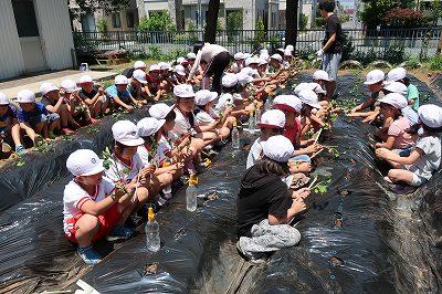 緑の学校ファームの畑に、さつまいもの苗を植えました。たくさん、さつまいもがとれるよう一生懸命、暑い中、がんばって植えました。毎年、栽培ボランティアの加納さんに御協力いただき、ありがとうございます。