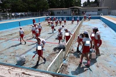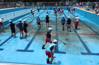 いよいよプールの季節がやってきました。今日は、5年生、6年生児童がプール清掃を行いました。きれいになったプールが輝いていました。最後は先生で仕上げました。