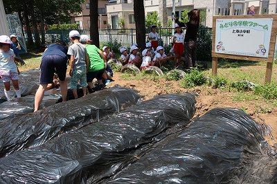 緑の学校ファームの畑に、さつまいもの苗を植えました。たくさん、さつまいもがとれるよう一生懸命、暑い中、がんばって植えました。毎年、栽培ボランティアの加納さんに御協力いただき、ありがとうございます。