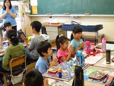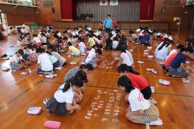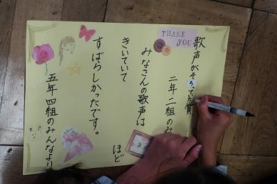 お互いに校歌を発表し合い、良さを認め合い、校歌が大好きな上沖っ子づくりをめざしています。お互いに賞をつけ合ってもいます。たとえば「歌声がきれいだったでしょう」とかです。