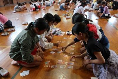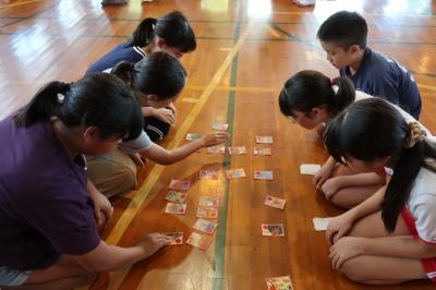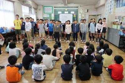 高学年と低学年のクラスが音楽室に集まり、「校歌交流会」を開催しています!