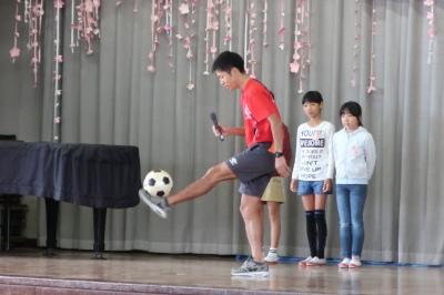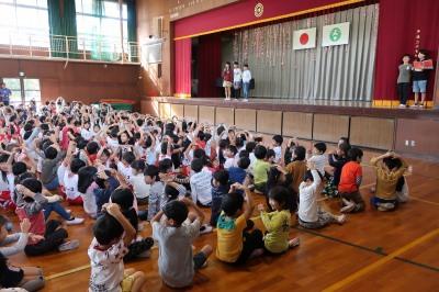 今朝の児童集会。代表委員から先生に関するクイズが出題されました。全問正解すると、上沖クイズ王です。正解発表には、出題された先生が壇上で答えを発表しました。パフォーマンス付きでとっても楽しい集会となりました。