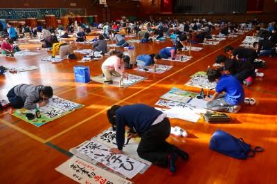 競書会が始まりました。書き初めは、広い体育館で実施しています。どの子も真剣な表情で、がんばっていました。