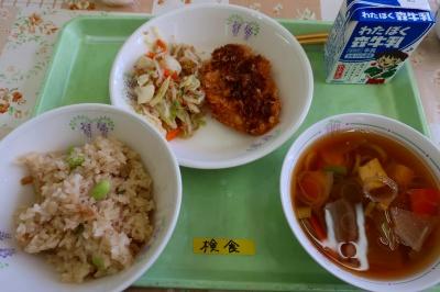 生姜ごはんにとんかつ。ヒレ肉とんかつは、柔らかくて厚くてとっても美味でした。ご飯もぴりっとおいしくてたくさん食べました。いつも調理員さん、おいしい給食をありがとうございます。