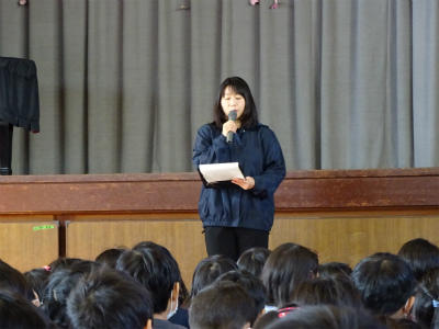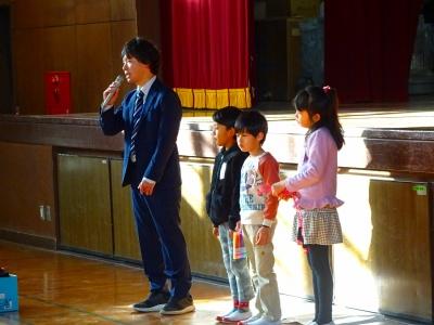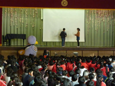 今日の朝の活動は、給食委員による児童集会があり、コバトンも参加しました。