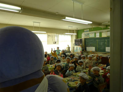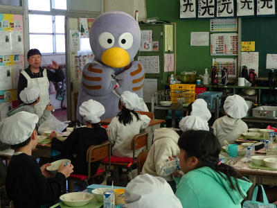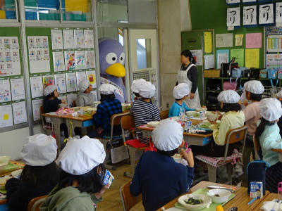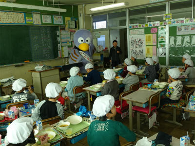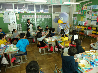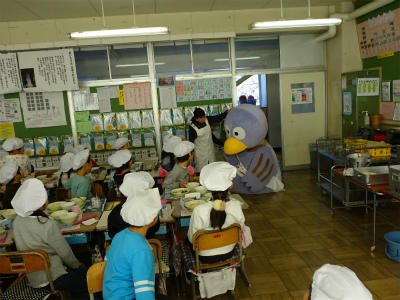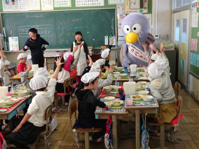 3年生の給食の様子を、コバトンが見て回りました。今日のメニューは、島根県の「まいたけご飯」でした。朝ご飯も給食も、みんなしっかり食べているので、コバトンも喜んでいました。