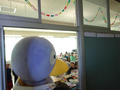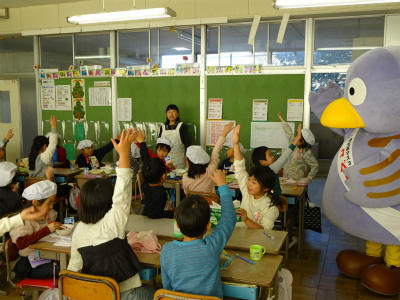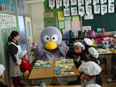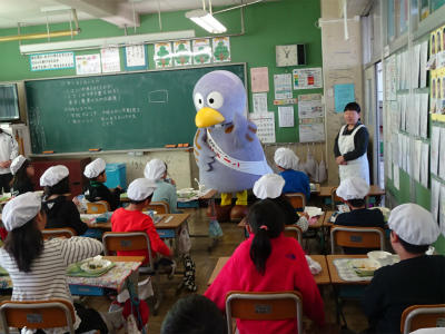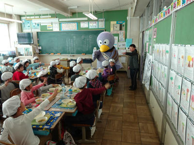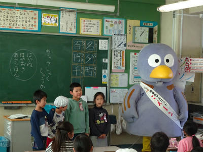 今日、上沖小にコバトンがやってきました。朝は、みんなの登校の様子を見守り、給食の時は、1年生と7・8組の教室を回り、朝ご飯を食べてきたか調べていました。