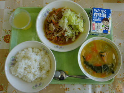 給食は、三ツ星給食入賞献立で、「元気100倍とんとん豚丼」でした。コバトンは、今日でコバトン星へ帰るため、最後にもう一度、1年生の給食の様子を見ていきました。