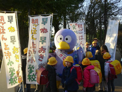 今日、上沖小にコバトンがやってきました。朝は、みんなの登校の様子を見守り、給食の時は、1年生と7・8組の教室を回り、朝ご飯を食べてきたか調べていました。