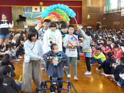送る会に参加した宮代特別支援学校のお友達が、終了後、6年生とお別れをしました。6年3組の児童がつくった、世界に一つしかない手作りの支援籍修了証とプレゼントを渡しました。支援学校のお友達からは、メッセージと花束をいただきました。こちらも心温まる出来事でした。
