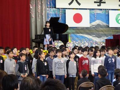 今年初めての音楽朝会。4月の歌は校歌とりにん式の歌です。音楽委員会の児童の伴奏で、全校で心を込めて歌いました。