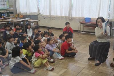 今年初めてのおはなし会。2年生と4年生の児童が真剣に楽しそうに聞き入っていました。