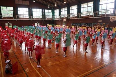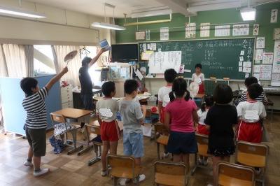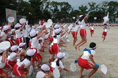 応援うちわをもって2回目の練習を行いました。応援団の児童が各クラスへ行き、指導をがんばっています!