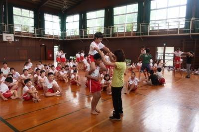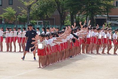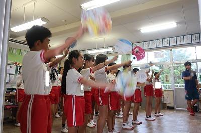 演技全体を通して練習できるようになってきました。かわいい飾りをつけたり、手に持ったりして頑張っています。今年、ラグビーのワールドカップが日本で開かれますが、5年生の競技にラグビーボールを取り入れた工夫もしています。