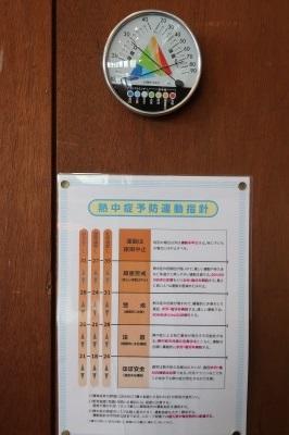 台風一過、今日も朝から猛暑です。校庭には黒球温度計、体育館にも暑さ指数を計測できる温度湿度計を用意して、熱中症予防に努めています。