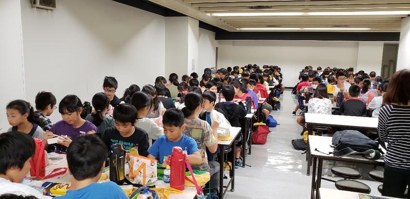 少し雨が降ってきたので、お弁当を食べています。違う団体からスペースをかしてもらい、室内で食べています。