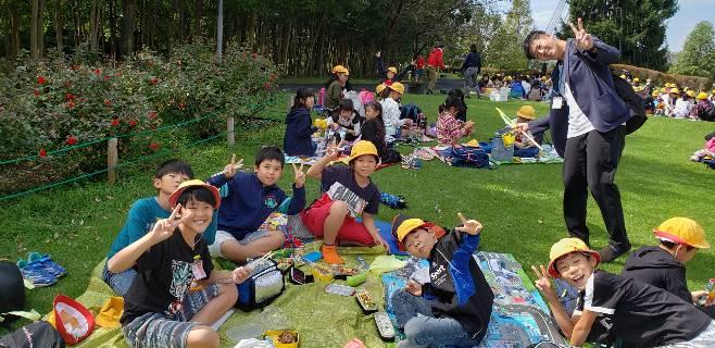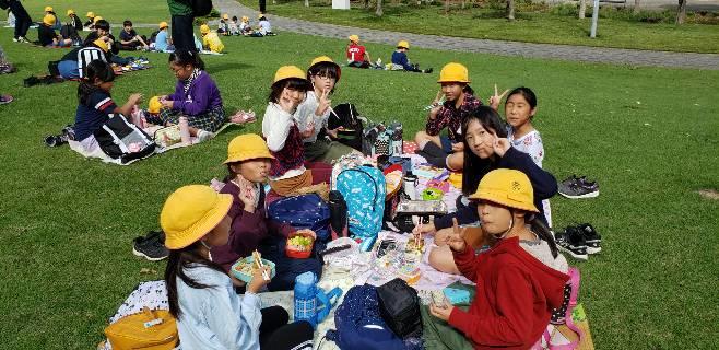 全校児童、縦割り班による青空ランチを実施! 今日、10月10日は、昔の「体育の日」で、晴天率の高い日。
