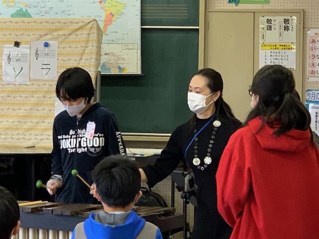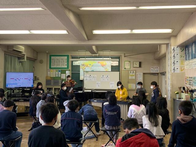 5年生は、音楽の時間に「日本の音楽に親しもう」のテーマで、5人のゲストティーチャーの先生にお越しいただき授業を行いました。J-POPの曲が「ド」「レ」「ミ」「ソ」「ラ」の5音を中心に作られていることを教わり、その5音を使っての音楽づくり体験にチャレンジしました。子どもたちは、ピアノ、バイオリン、ベースを演奏してくれるゲストティーチャーの先生方の生演奏に合わせて、緊張しながらも貴重な体験をすることができました。PCを活用して音楽づくりをした子どもたちもいました。子どもたちから「楽しくて、あっという間に、時間が過ぎてしまいました」という感想も聞かれました。