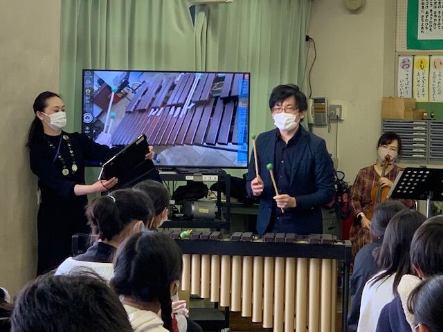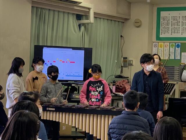 5年生は、音楽の時間に「日本の音楽に親しもう」のテーマで、5人のゲストティーチャーの先生にお越しいただき授業を行いました。J-POPの曲が「ド」「レ」「ミ」「ソ」「ラ」の5音を中心に作られていることを教わり、その5音を使っての音楽づくり体験にチャレンジしました。子どもたちは、ピアノ、バイオリン、ベースを演奏してくれるゲストティーチャーの先生方の生演奏に合わせて、緊張しながらも貴重な体験をすることができました。PCを活用して音楽づくりをした子どもたちもいました。子どもたちから「楽しくて、あっという間に、時間が過ぎてしまいました」という感想も聞かれました。