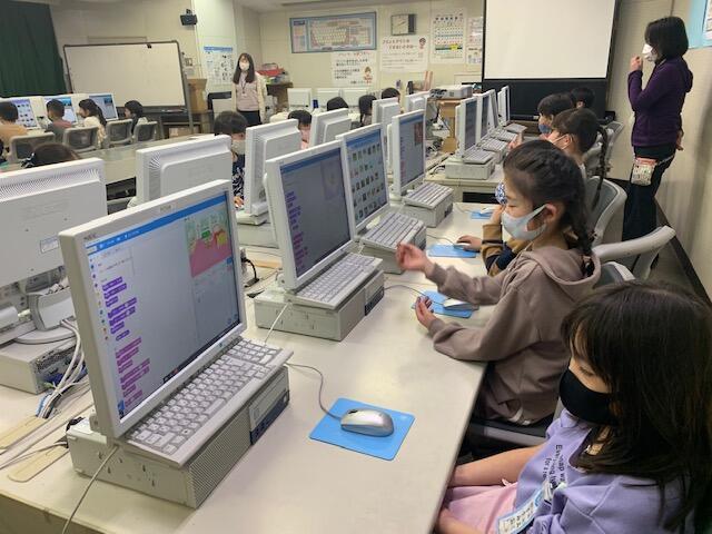 PCの操作に慣れてきた1年生は、授業の後半から上級生が活用しているソフト「スクラッチ」にもチャレンジしました。