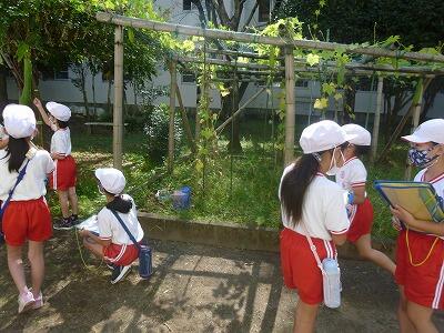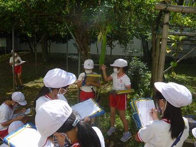 4年生がヘチマの観察をしていました。大きく育ったヘチマを、しっかり見て、触って、調べて観察メモに記録していました。
