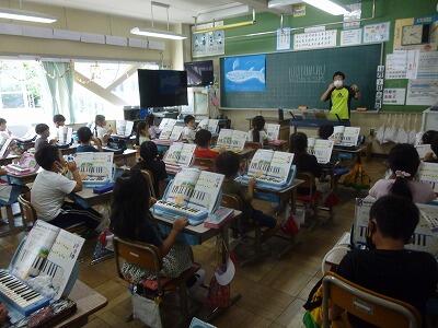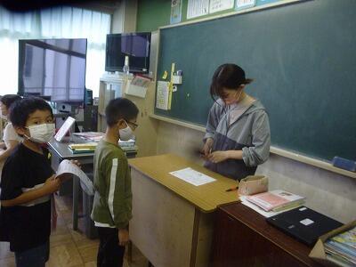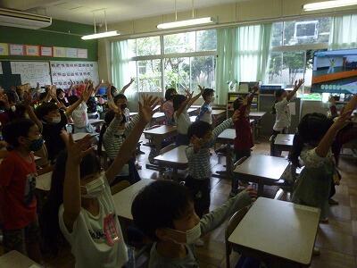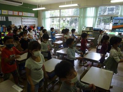朝は音楽朝会でした。まだ全校で集まることはできないため、ビデオでうまく歌う歌い方を視聴し、「ゆかいななかま」をクラスで歌いました。
