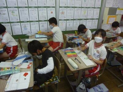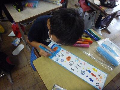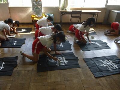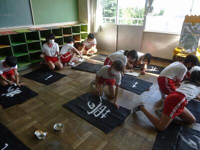 5年生は、運動会のソーラン節に着る「はっぴ」のデザイン(一文字)を作成していました。