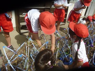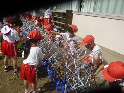 自分の鉢で育てたアサガオの弦を使ってリースを作りました。みんなとてもかわいい飾りをつけてすばらしい作品に仕上がりました。