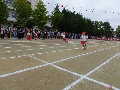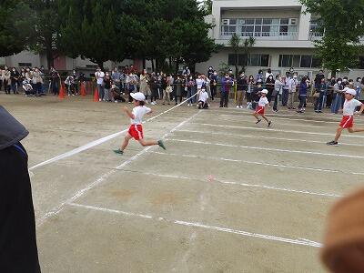 第2部は9時35分から3・4年生が徒競走と表現を行いました。保護者の方々は、カメラやビデオに記録を残し、子どもたちの演技を思い出に残していました。3年生は50m、4年生は70mを一生懸命走りがんばりました。