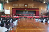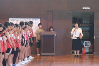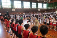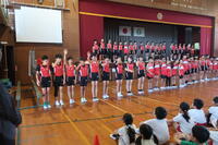 今朝は全校のみんなで体育館に集まり、上沖小の代表として出場する選手に、全校みんなでエールを送りました。