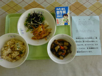 3年生の給食の様子を、コバトンが見て回りました。今日のメニューは、島根県の「まいたけご飯」でした。朝ご飯も給食も、みんなしっかり食べているので、コバトンも喜んでいました。
