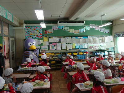 給食は、三ツ星給食入賞献立で、「元気100倍とんとん豚丼」でした。コバトンは、今日でコバトン星へ帰るため、最後にもう一度、1年生の給食の様子を見ていきました。