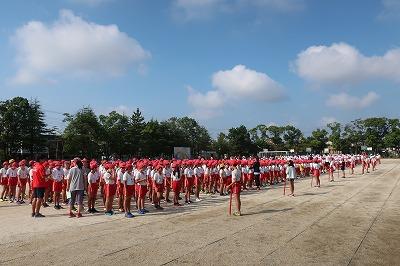 今朝、初めての運動会全体練習を行いました。暑さのため、長い時間はできませんでしたが、開閉会式の隊形を確認しました。
