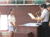 埼玉県硬筆展5名、県民総合体育大会2名の児童が、壇上で校長先生より賞状をいただきました。