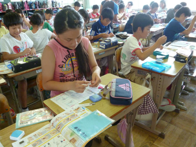 5年生の家庭科の様子です。初めて針と糸を使い、玉結び、玉止めの練習をしました。