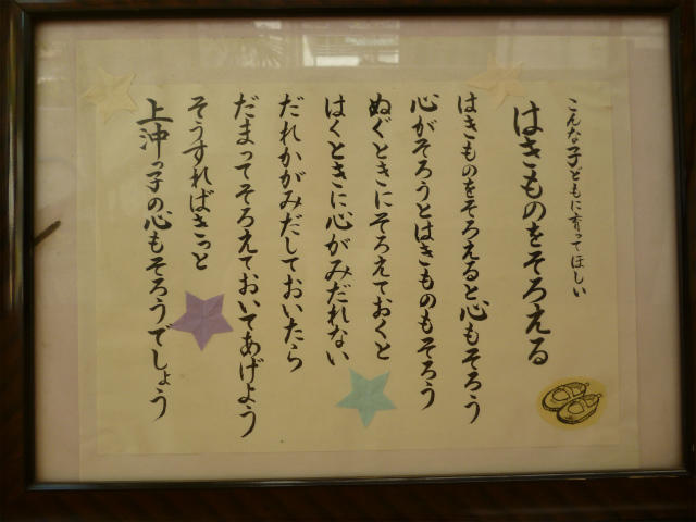 上沖小の玄関に飾られています。こんな上沖っ子になってほしいという願いが込められています。