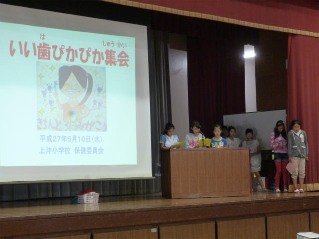 今朝は、保健委員会の児童による「いい歯ぴかぴか集会」がありました。上沖小の児童のむし歯の状況や治療した児童への表彰、劇やクイズなど、とても工夫された発表でした。
