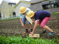 4年生と7・8組の子供たちが、一ノ割上根公園に行ってコスモスの種まきをしてきました。毎年、上沖小の子供たちが種まきをします。種をまく子、板を使って土をかける子、二人組での共同作業です。約2,400平方メートルの畑に一生懸命種まきをしました。10月には、様々な色のコスモスの花が咲くのを楽しみに待っています。