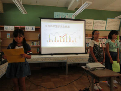 今回の議事は、①新体力テストの結果について、②定期健康診断結果について、③食育についてです。それぞれ、運動委員会、保健委員会、給食委員会の児童が、日頃の活動や議事の内容につて調べたこと・話し合ったこと等を発表しました。