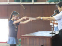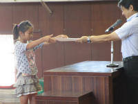 埼玉県硬筆展5名、県民総合体育大会2名の児童が、壇上で校長先生より賞状をいただきました。