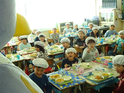 給食は、三ツ星給食入賞献立で、「元気100倍とんとん豚丼」でした。コバトンは、今日でコバトン星へ帰るため、最後にもう一度、1年生の給食の様子を見ていきました。